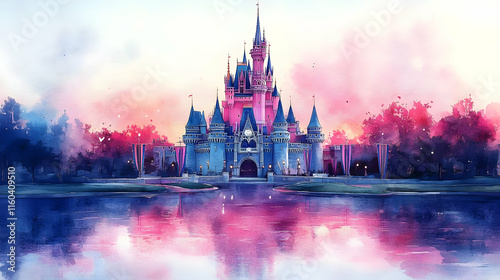 Obraz premium Fairytale Castle Reflects in Water, Pink and Blue Hues