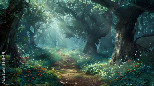 © Mitchell, Fototapeta premium Fairytale Forest with Majestic Trees and Lush Vegetation - Generative AI Digital Painting