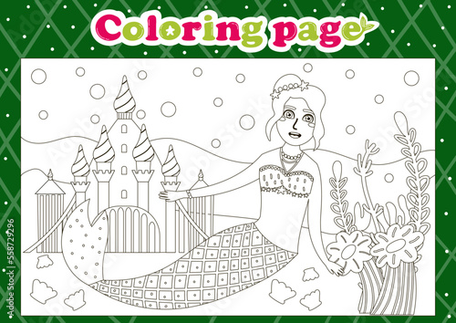 Fototapeta premium Fairytale themed coloring page for kids with cute mermaid character and underwater kingdom
