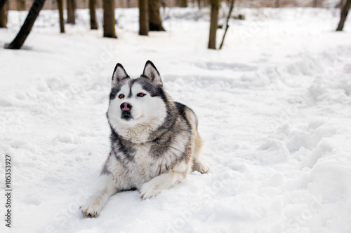 © Mironifamily, Naklejka premium Faithful huski is laying