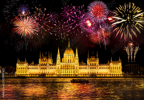 © EKH-Pictures, Obraz premium Fajerwerki nad parlamentem w Budapeszcie na Węgrzech