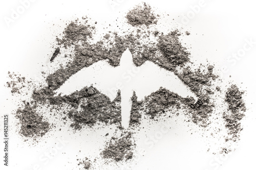 Naklejka premium Falcon, hawk, phoenix, eagle silhouette drawing made in ash as rebirth, birth, death, life, ecology disaster, fire, freedom concept symbol illustration