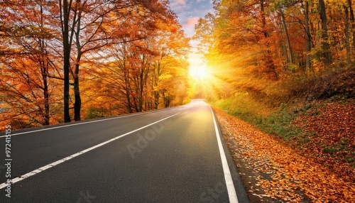 © Tilak, Fototapeta premium Fall background, Autumn Road to Serenity: Golden Sunlight and Fall Foliage