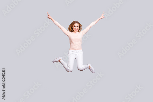 © deagreez, Fototapeta premium Fall beauty fashion style stylish modern entertainment people person weekend holiday vacation concept. Full-length full-size portrait of cheerful delightful lady jumping up isolated on gray background