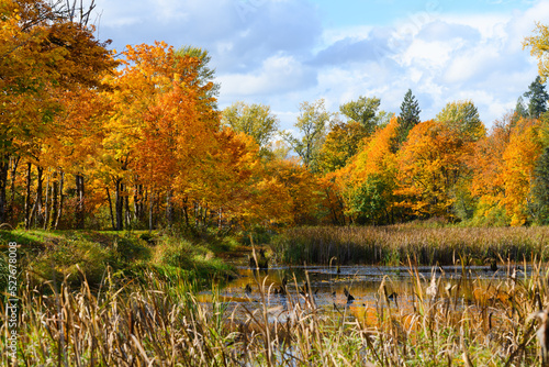 © IanDewarPhotography, Fototapeta premium Fall colors in rich yellow and orange surround a pond in the Snoqualmie Valley