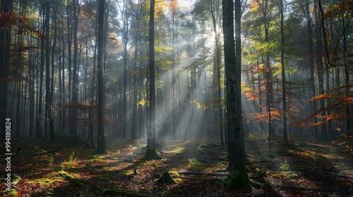© Nadya, Obraz premium Fall foggy forest with light rays