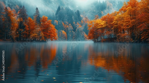 Fototapeta premium fall foliage forest, a peaceful lake encircled by trees displaying golden and...