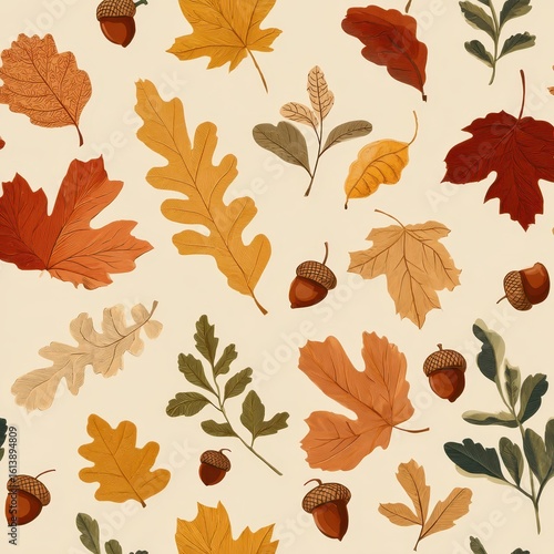 Obraz premium Fall foliage pattern colorful autumn leaves & acorns scattered on a neutral...
