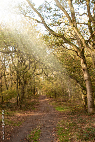 Naklejka premium Fall landscape, bright fall trees and yellow fallen leaves. Autumn alley in...