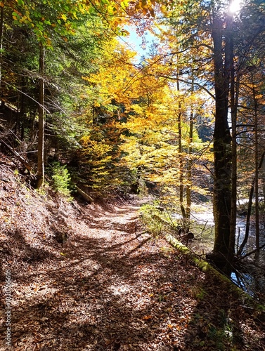© Simun Ascic, Obraz premium Fall landscape in forest, mountain road covered with leaves