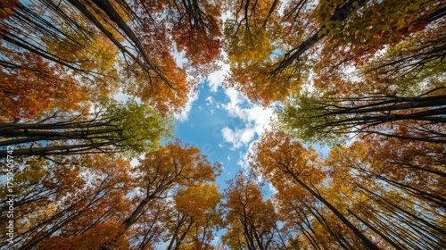 Obraz premium Fall leaves in forest canopy against blue sky, perfect for autumnthemed...