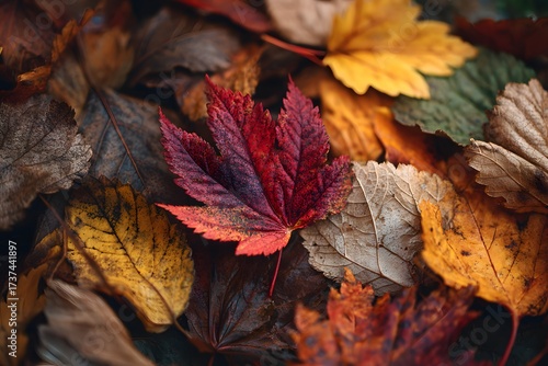 © ckybe, Obraz premium Fall leaves in warm colors sprinkle like nature’s confetti for cozy autumn vibes.