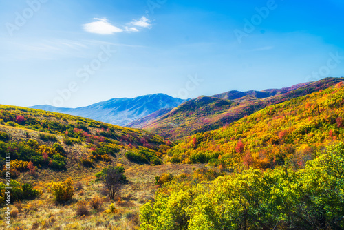 © Nicole, Fototapeta premium Fall mountains in valley. Happy and bright sunny day
