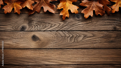 Fototapeta premium fall oak leaves border on an old wood background сreated with Generative Ai