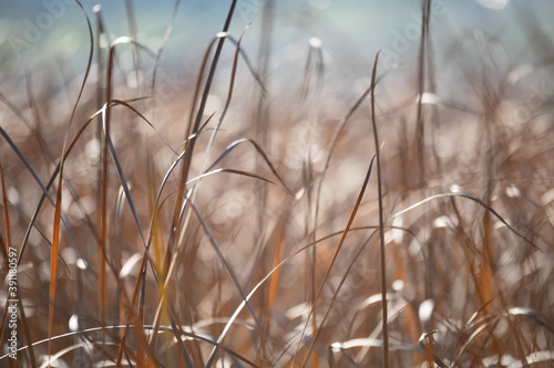 Fototapeta premium Fall orange reeds in morning sun backlight. Brushwood of cane blowing in the wind. Wild grass next to water. Tuft of grass.