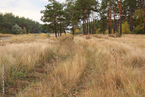 © sveten, Obraz premium Fall pine forest at cloudy day