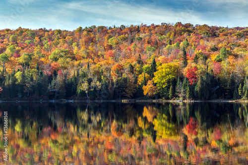 Fototapeta premium fall reflection, colorful trees reflected in Lake Bouchard in La Mauricie...