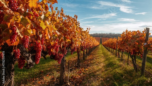 © The 2R Artificiality, Naklejka premium Fall Scene Featuring Crimson Grapes in a Vineyard