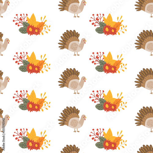 Fototapeta premium Fall thanksgiving pattern with autumn leaves and plants, animals. Cute fabric design. Thanksgiving day seamless background in traditional colors for clothes, textile, wrapping papers. Cute elements.