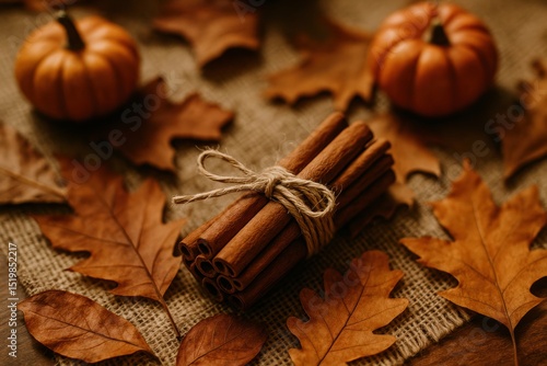 Fototapeta premium Fall-themed flat lay with cinnamon sticks, leaves, and pumpkins on rustic background