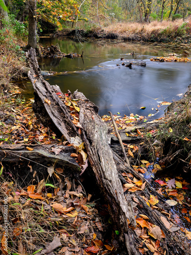 Fototapeta premium Fall trees across a fast flowing brook in autumn