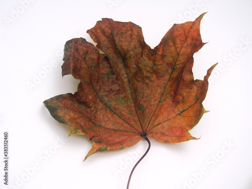 © tar9, Obraz premium Fallen autumn maple leaf on a white background.