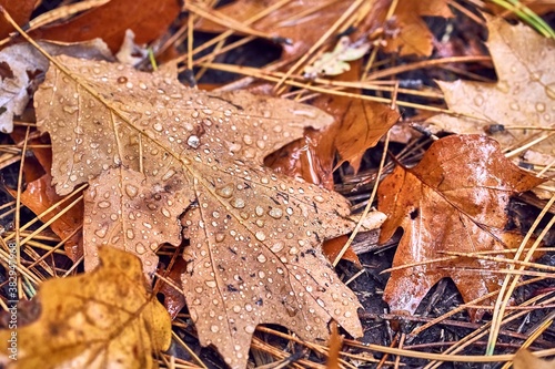 © Gudellaphoto, Fototapeta premium Fallen leaf on ground covered with raindrops, wet leaves