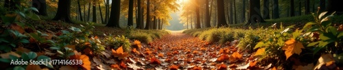 © Kanoknuch, Obraz premium Fallen leaves carpet a secluded forest track in Sweden, fall, nature