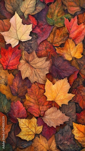 © DreamPointArt, Obraz premium Fallen leaves in vibrant colors scattered on the ground during autumn highlight the beauty of nature's transition