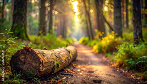 © matkhairul, Obraz premium Fallen Log on Forest Path with Sunlight