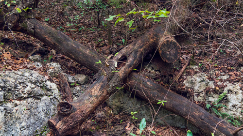 © JCLGarcia, Fototapeta premium Fallen small trees in a forest making an X formation on the ground