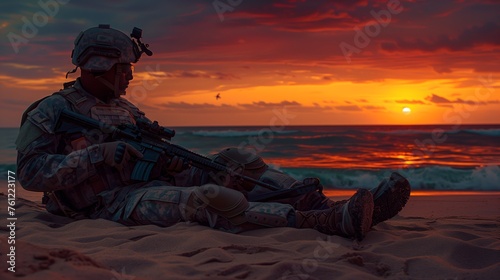 Naklejka premium Fallen Soldier's Boots, Rifle and Helmet at Sunset