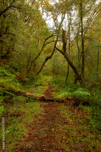 Naklejka premium Fallen tree on a path of red leaves in a beautiful forest in the area of Galicia, Spain.