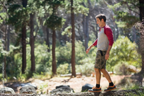 © wavebreak3, Fototapeta premium Fallen tree trunk resting on uneven pine forest floor with scattered rocks and sunlit underbrush