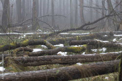 Fototapeta premium Fallen trees in foggy forest