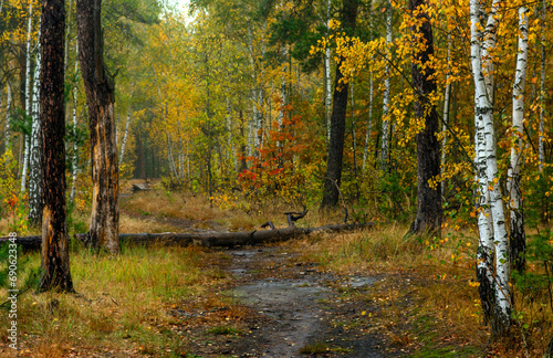 © Mykhailo, Fototapeta premium Fallen trees in the forest. Beauty of nature. Hiking. Walk outdoors.