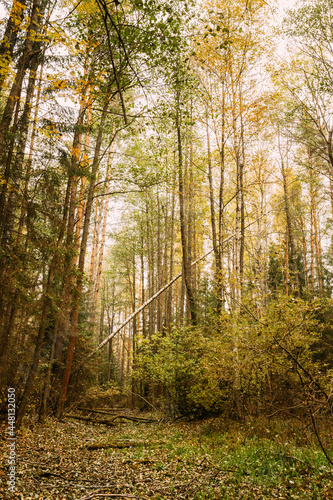 Obraz premium Fallen trees in wild coniferous forest reserve