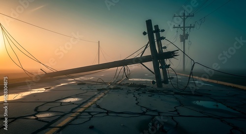 © Design Vault, Naklejka premium Fallen utility pole and power lines on a cracked road at sunset, depicting a scene of disaster and infrastructure damage.