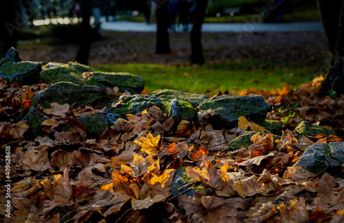 Obraz premium Fallen yellow leaves in autumn in the park