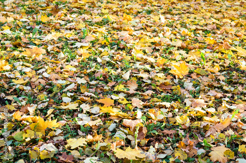 © Ekaterina, Obraz premium fallen yellow leaves on city lawn in autumn