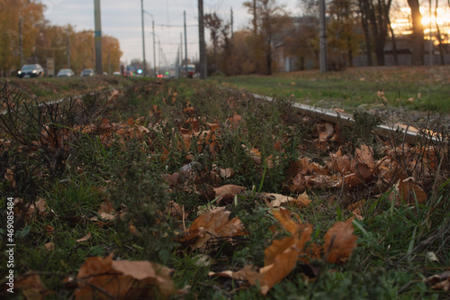 © Vladislav, Obraz premium Fallen yellow maple leaves lie on the road, between steel rails.