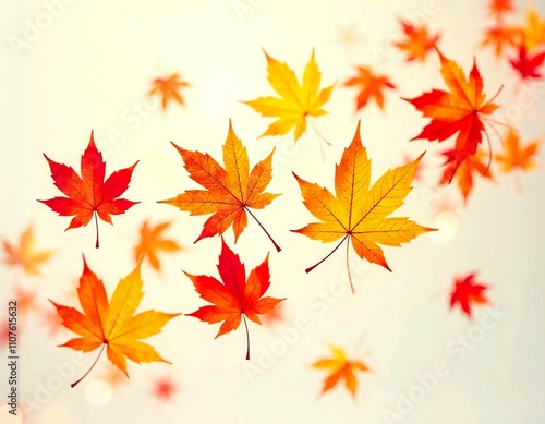 © Eva, Obraz premium Falling autumn leaves, including orange, red, and yellow maple leaves, on a white background