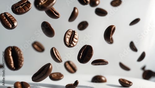 Fototapeta premium Falling coffee beans isolated on a textured white surface