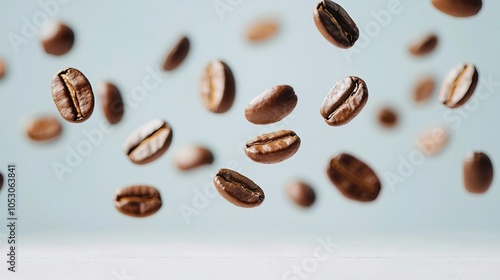Obraz premium Falling coffee beans isolated on a white background, creating a dynamic...