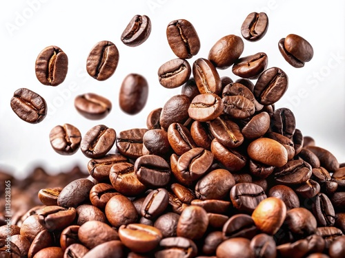 © prapatsorn, Naklejka premium Falling Coffee Beans Isolated on White Background for High-Quality Fashion Photography and Creative Culinary Designs