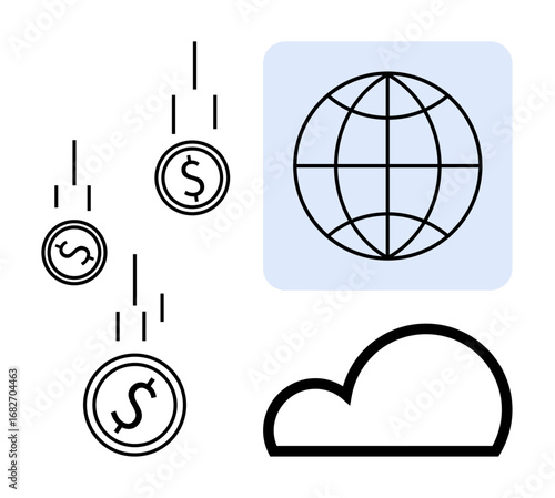 Fototapeta premium Falling coins with dollar signs, globe symbol in blue square, outline of cloud shape. Ideal for finance, cloud computing, globalization, e-commerce, economy, digital business simple flat metaphor