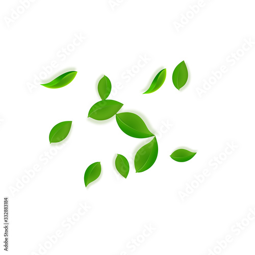 © Begin Again, Naklejka premium Falling green leaves. Fresh tea neat leaves flying