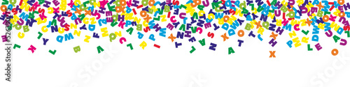 © Begin Again, Fototapeta premium Falling letters of English language. Colorful flying words of Latin alphabet. Foreign languages study concept. Pleasant back to school banner on white background.