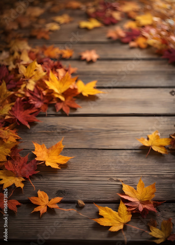 © Afifa43, Obraz premium Falling maple leaf's on the empty wooden table top in autumn