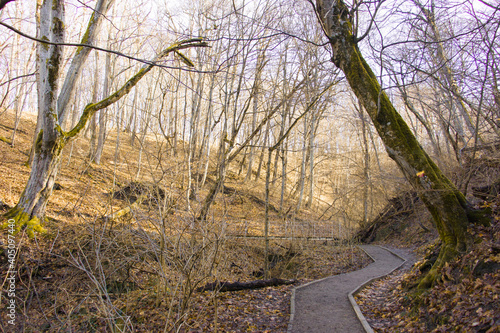 © Dyukareva Olga, Obraz premium Falling oak leaves on the scenic autumn forest illuminated by morning sun